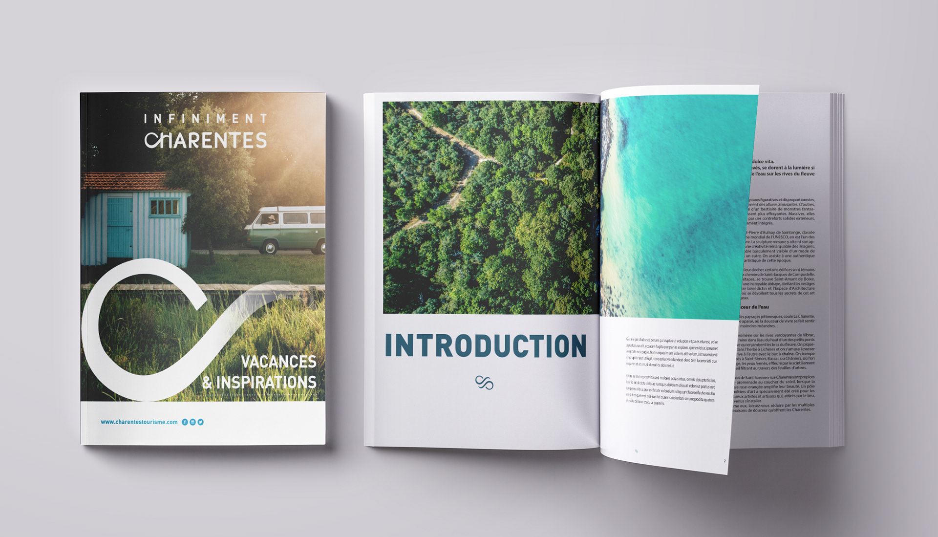 Layout of the press kit of Infiniment Charentes, client of the agency Le Ciré Jaune. Creation of the maps "Les Charentes en chiffres" and "L'effervescence en Charentes".